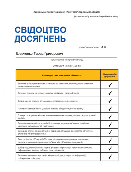 Після закінчення кожного навчального року учень отримує документ державного зразка (свідоцтво досягнень, табель, свідоцтво про базову загальну середню освіту після 9 класу та , свідоцтво про повну середню освіту після 11 класу).